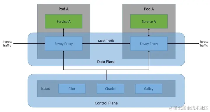 控制平面基本上是服务网格的大脑。它为数据平面中的Envoy代理提供发现,配置和证书管理。