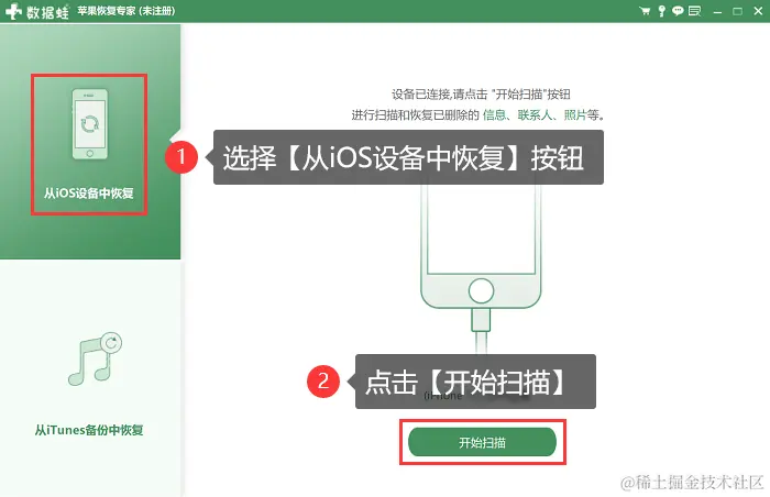 步骤3:点击【从iOS设备中恢复】模式,然后单击【开始扫描】按钮。这时软件会自动开始扫描您的设备数据,具体扫描所需时间取决于您的数据多少以及大小,请大家在扫描的过程中耐心等待。