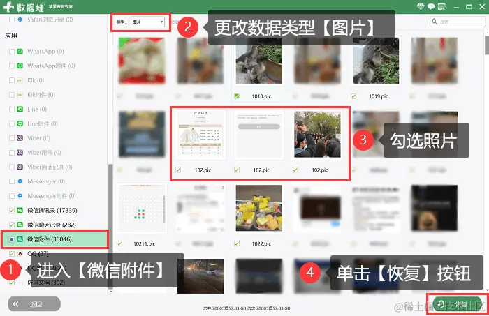 步骤4:扫描结束后,在左侧数据中选择【微信附件】选项。如果想更加快速地定位到微信照片,那么可以在数据上方将类型更改为【图片】进行分类。筛选好之后将想要恢复的照片勾选起来,然后单击【恢复】按钮将照片保存在电脑上。