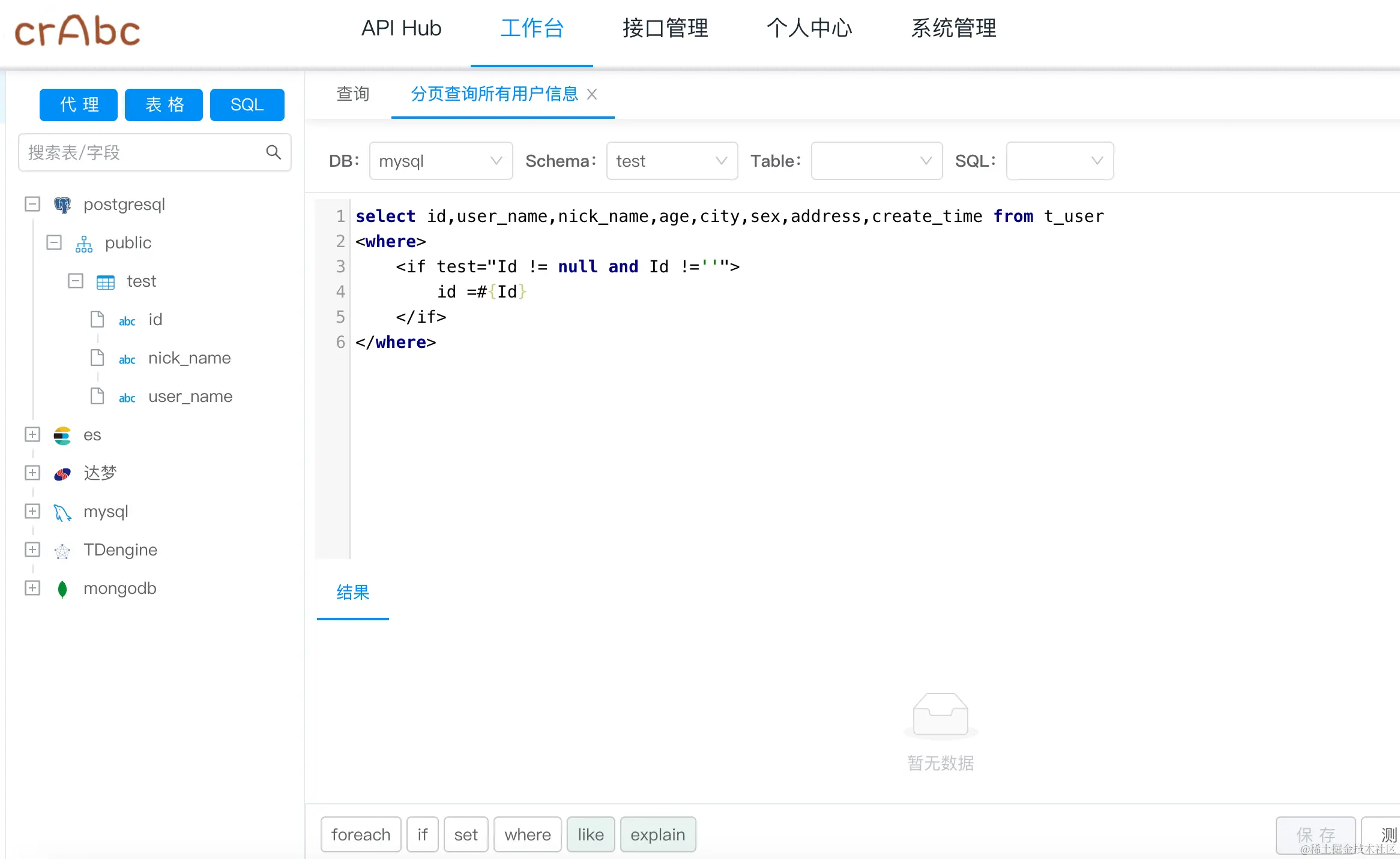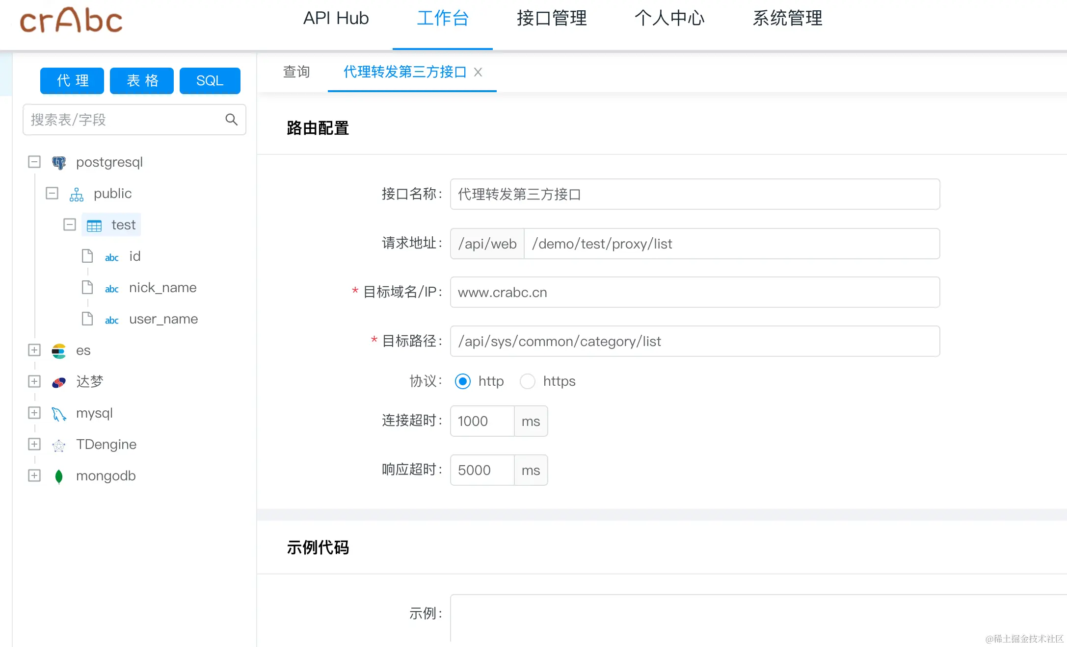 Crabc 是一款低代码接口管理平台,为软件开发提供一个通用的接口平台,通过灵活的动态加载和插件的方式减少企业在基础功能开发的时间投入让开发者更专注于核心功能的思考,提升软件的开发周期和效率。