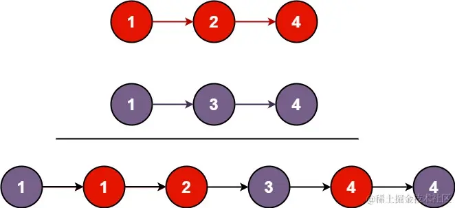 输入:l1 = [1,2,4], l2 = [1,3,4] 输出:[1,1,2,3,4,4]