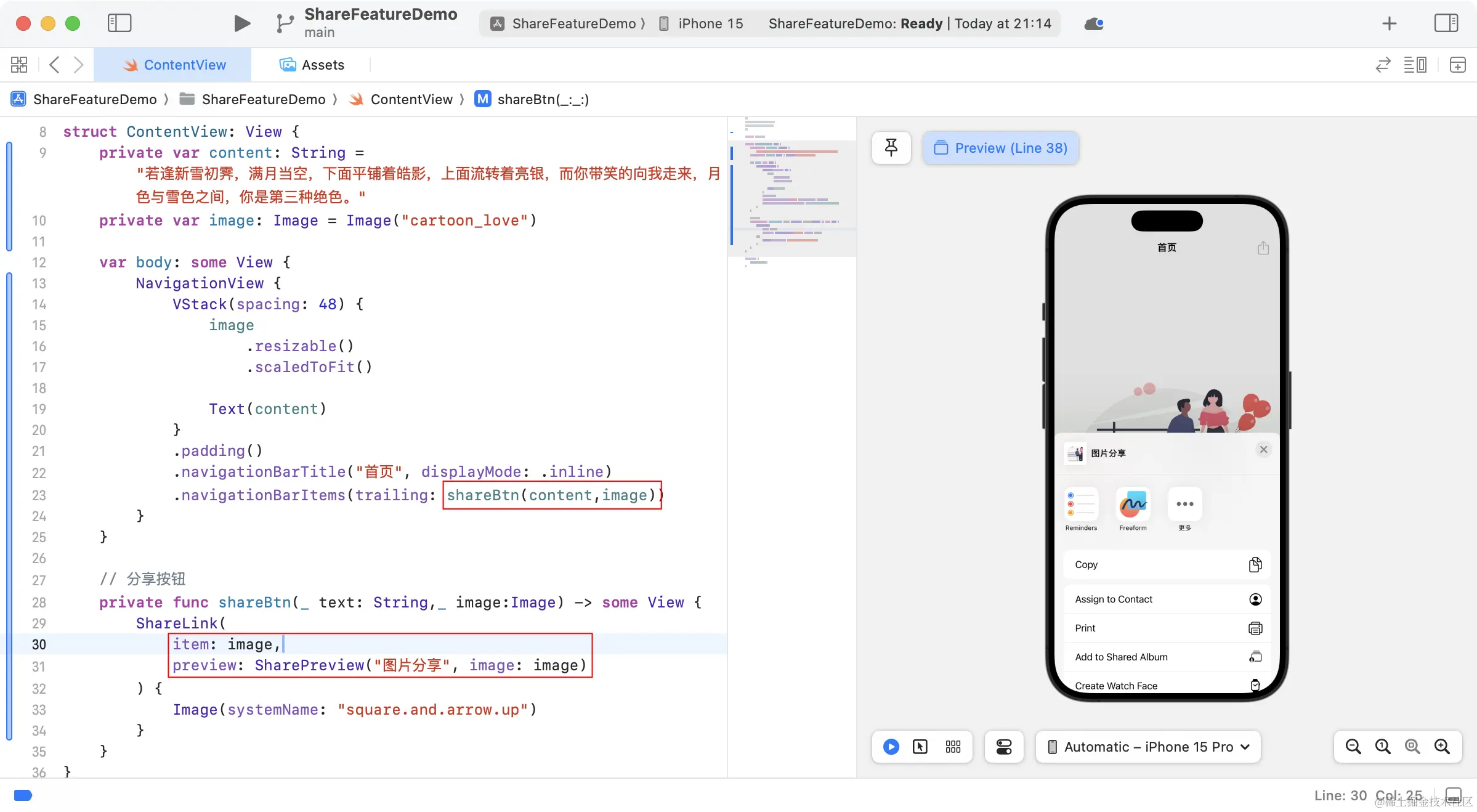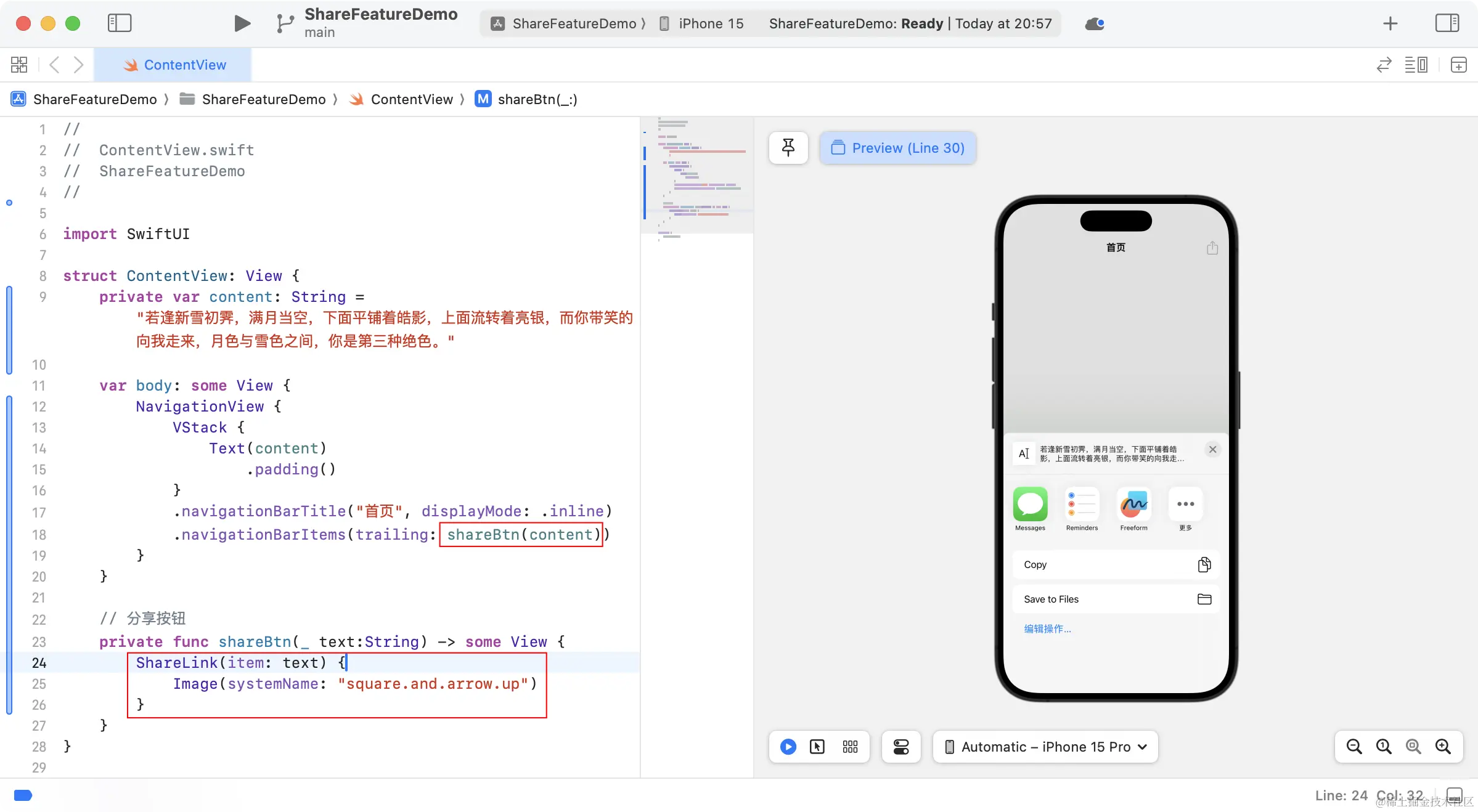 下一步,我们来实现分享文本文字的功能,需要使用到iOS16版本新增的ShareLink视图,使用方法和Button按钮视图类似,如下图所示: