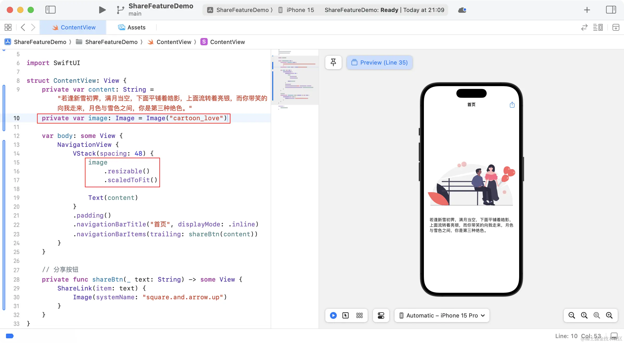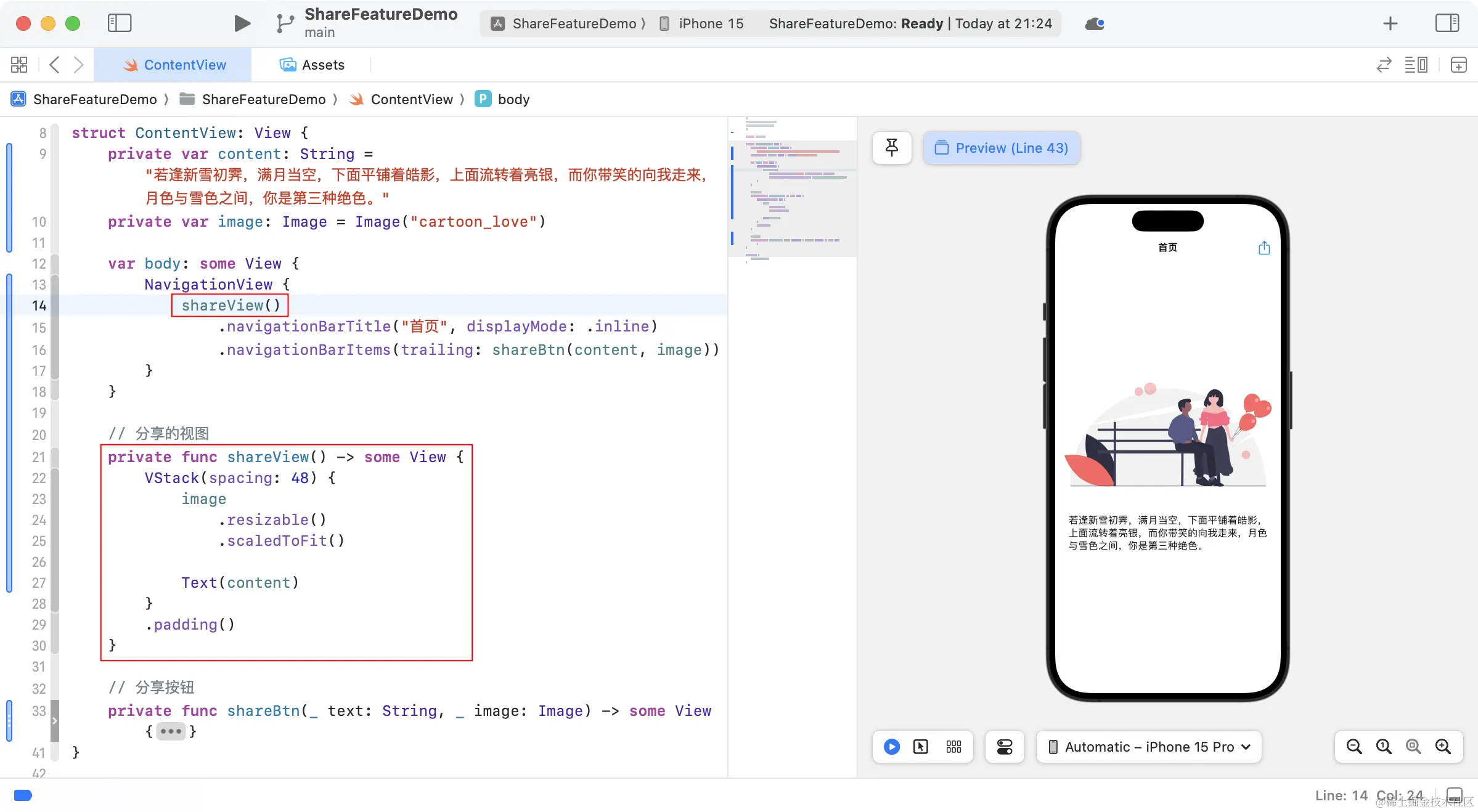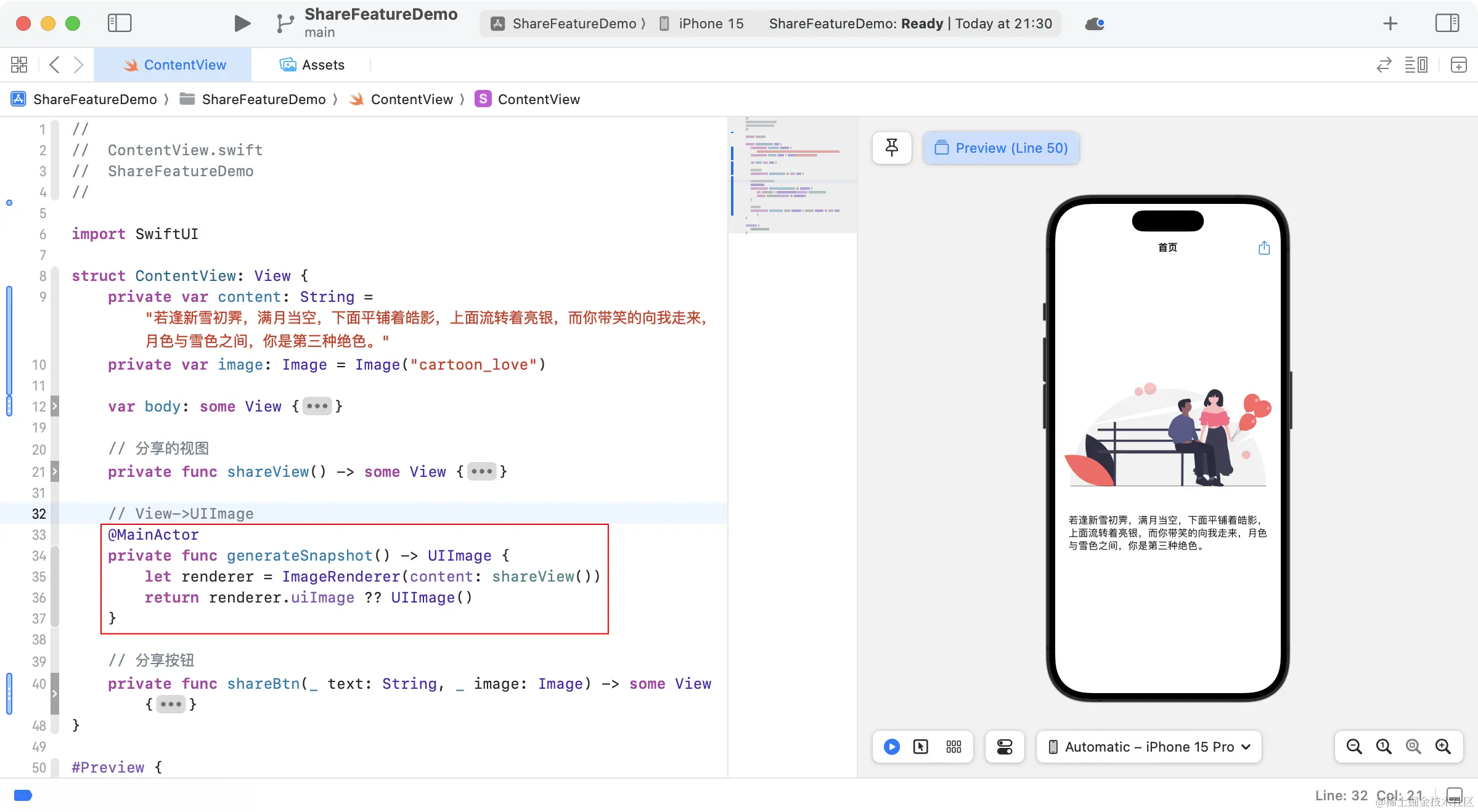 上述代码中,我们单独创建了分享的组合视图shareView,并将原本主视图中的图片+文本的组合视图代码迁移到shareView视图中。完成后,我们就可以直接在其他地方调用shareView视图来显示shareView视图中的内容。