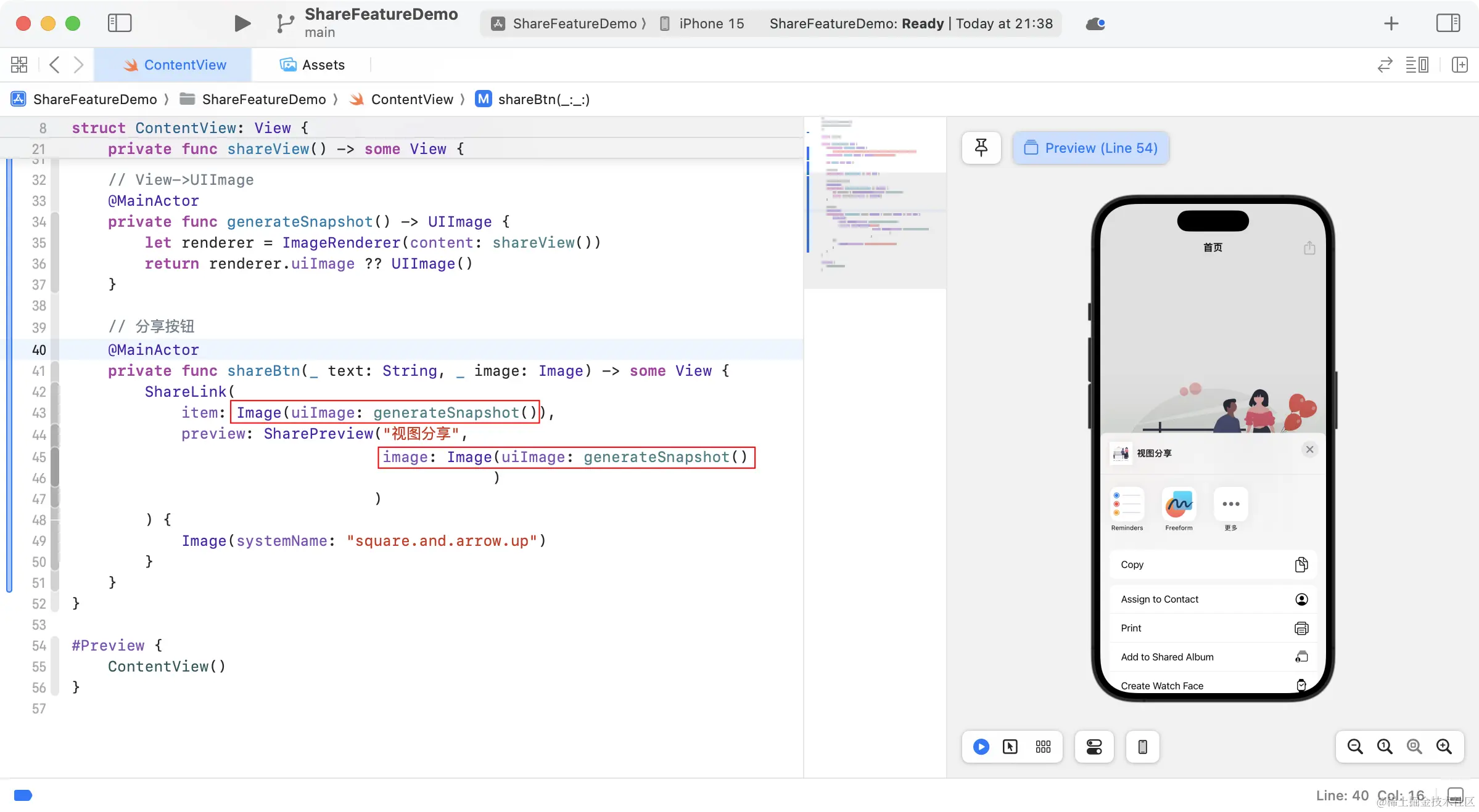 上述代码中,我们可以使用Image视图的uiImage参数解析generateSnapshot图片数据,就可以实现分享视图的功能啦~
