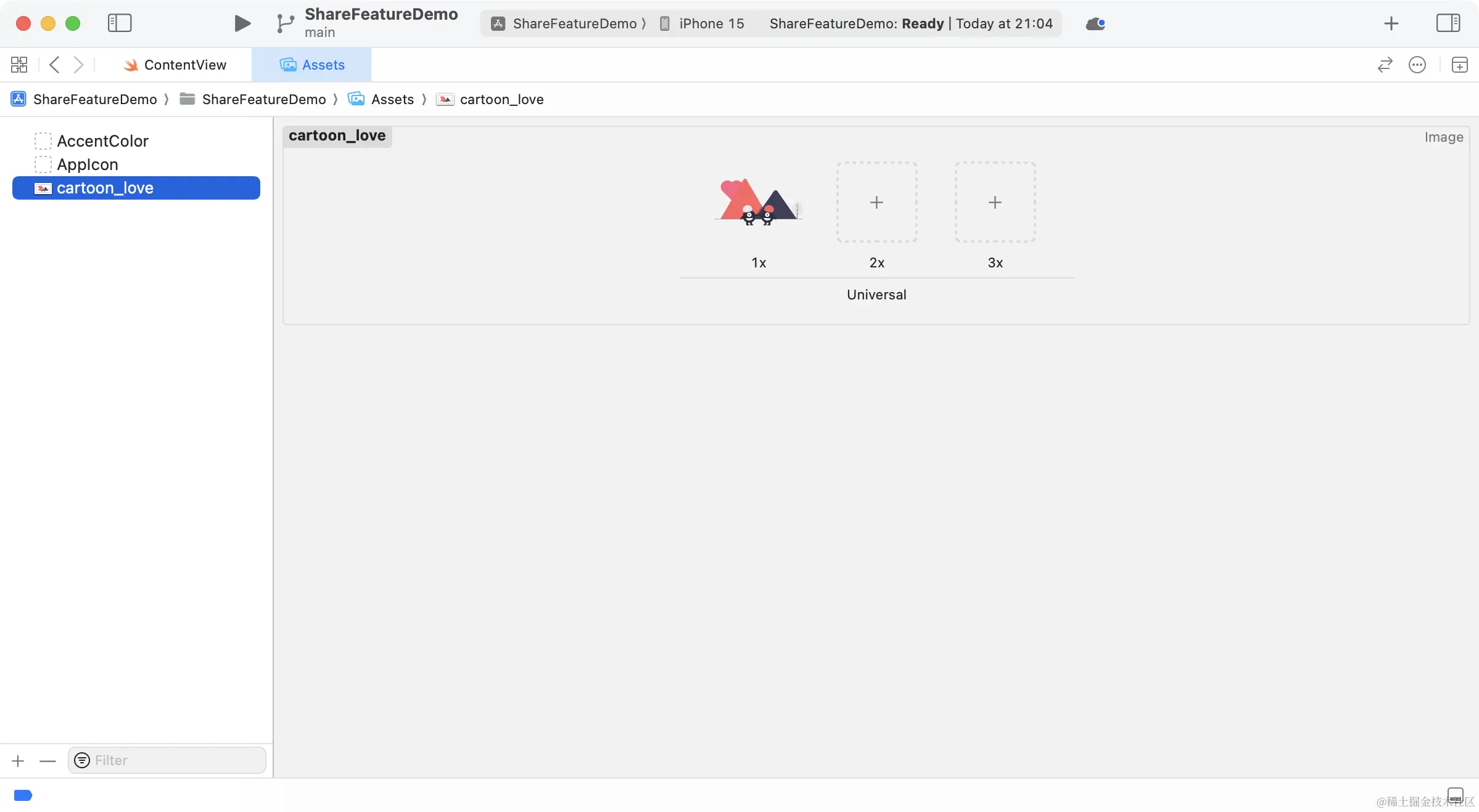 由于ShareLink支持多种类型,因此分享图片的方式也类似。我们在Assets资源库导入一张图片,如下图所示: