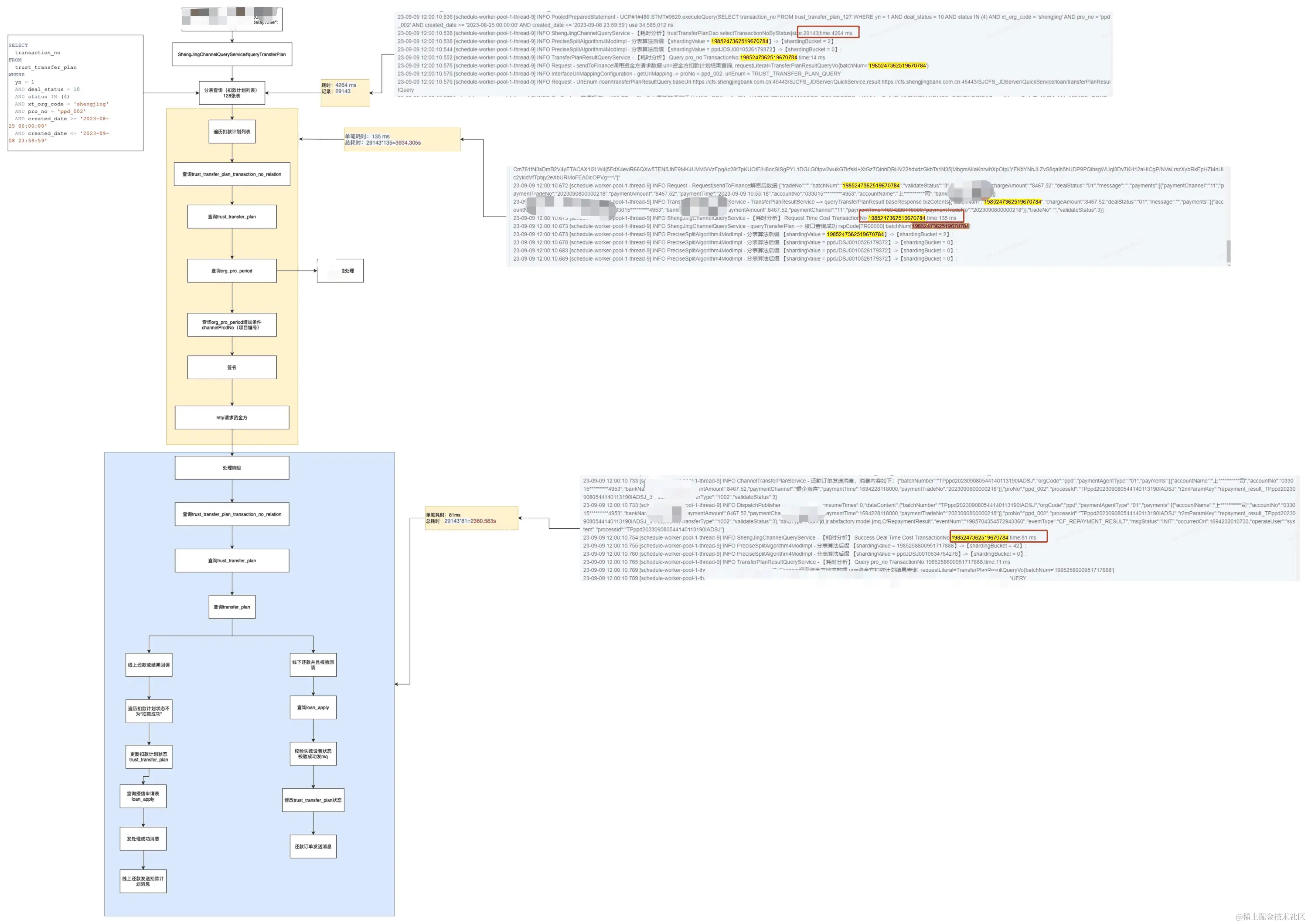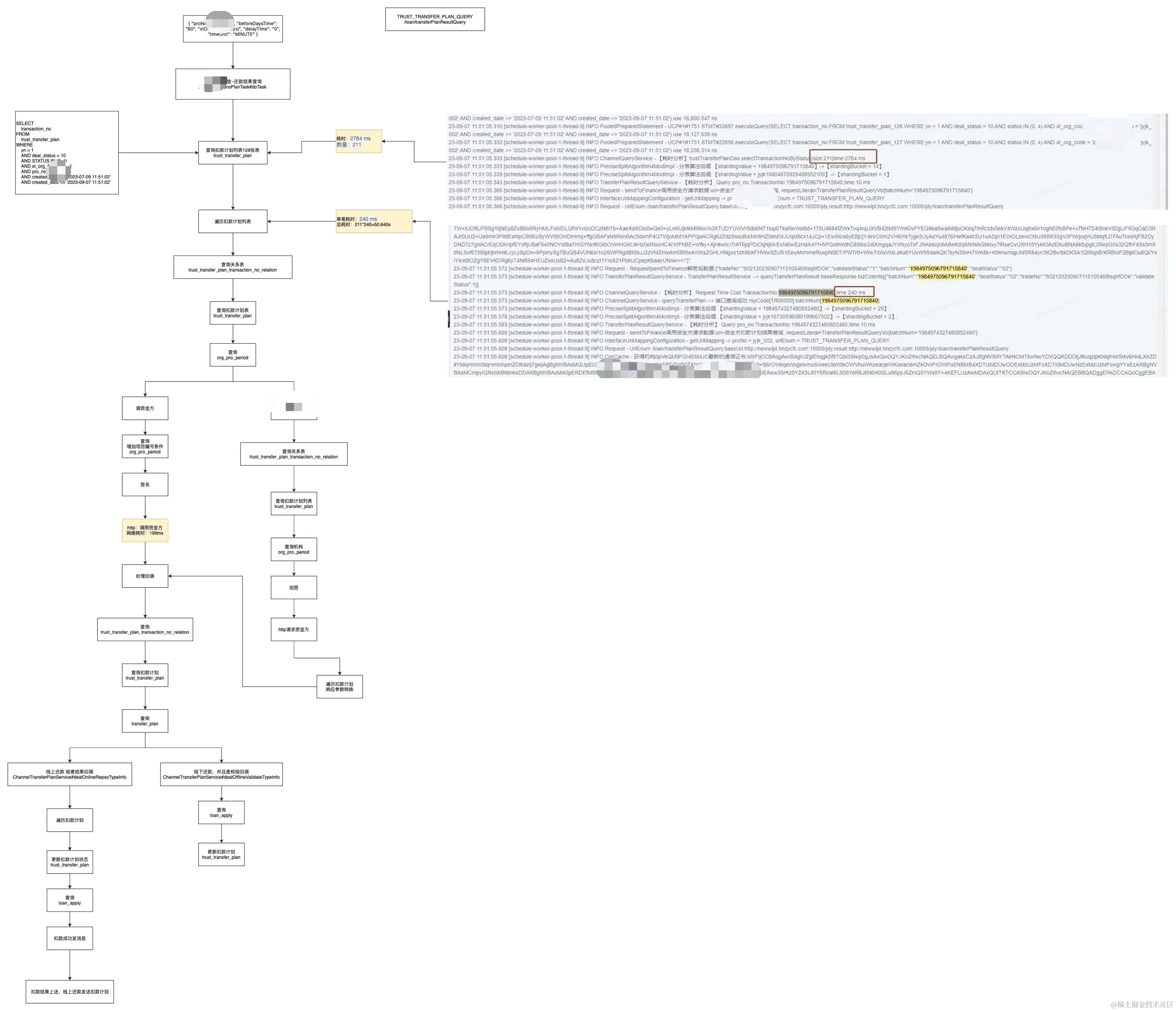 当然这个方案治标不治本,降低定时任务的执行时间只能说会降低数据不一致产生的频次,即使将定时任务优化到执行完成进需要2s,上线的时候只要不刻意避开定时任务的执行的话,还是会存在在倒计时结束的第60s时正好撞上定时任务正在执行的场景。不过还是借此机会排查了一下定时任务耗时的原因,其主要原因如下。其中以目前耗时比较长的定时任务(还款结果查回)为例。