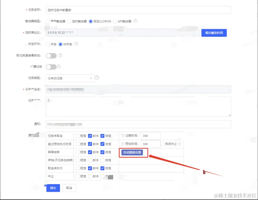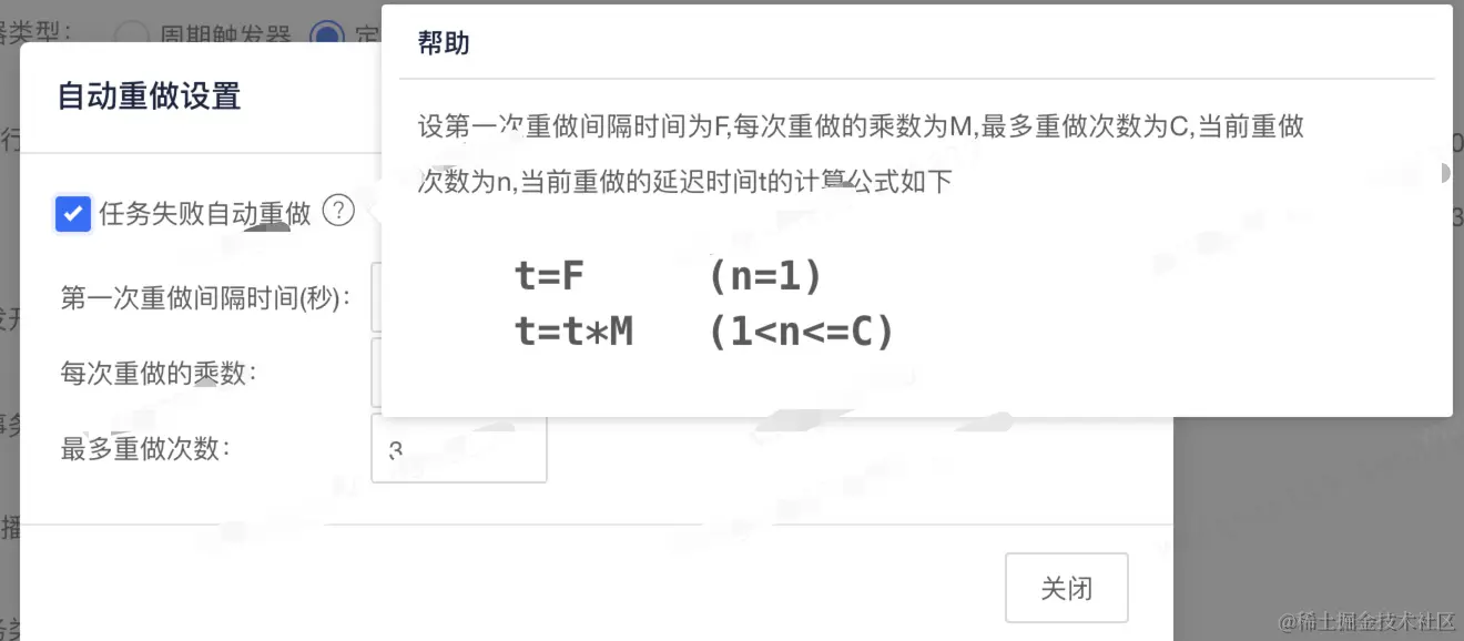 通过调研EasyJob定时任务平台发现提供了自动重做机制,通常我们一般部署的服务都是多台机器,即当我们上线的这台机器上面的定时任务执行中断后,可以通过配置自动重做机制来自动选择现有的存活的机器执行,其中自动重做里面中设置的参数如下:可以通过调整参数来控制第一次重做延迟时间、后续的重做时间间隔、以及最多重做次数。为什么要配置重做次数呢?一般机器上线是陆续进行的,极端情况下,定时任务执行时间完全覆盖了所有机器的上线时间,那么定时任务就会分别在每台机器上面中断一次,最终还是回归到最开始的那台机器上面继续执行(此刻该机器已上线完成)。所以针对定时任务时间执行比较长的,需要根据实际机器设置合理的重做次数。
