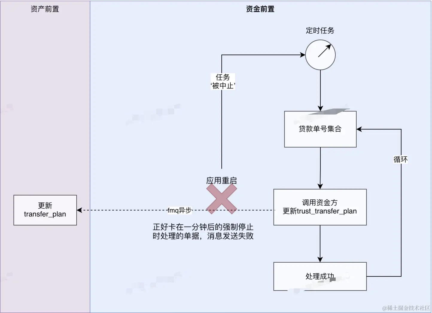为了便于快速理解上线停机时导致业务数据不一致的的具体环节,简要的绘制一个业务流程图如下,其中以资金前置应用为例,定时任务运行在资金前置应用上,当涉及到资金前置应用的重启或者停机时,之前的优雅停机改造是会先把RPC反注册和MQ暂停消费,然后在预留60s的时间以供存活的线程执行完毕。其实这么做确实还是有缺陷的,就比如60s也不能确保所有的存活线程执行完毕,文中前言中所提到的问题就是这个,由于定时任务执行时间大于60s,所以就会存在在定时任务尚未执行完成的情况下,强行把该定时任务给销毁掉了,恰巧两个数据表的更新还不在一个位置,导致停机完成的第60s正好在其中的一个表更新完成和发送MQ去更新另一个数据表之间,这样就会存在两个表的数据不一致。
