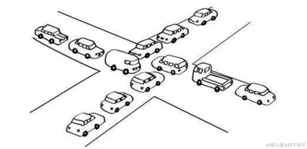 Java中的死锁是指多个线程同时占用一些共享资源且彼此相互等待,从而导致所有的线程都被阻塞,不能继续执行程序的情况。这就好比在一个十字路口,没有交警也没有红绿灯指挥通行,所有的车辆都占据道路且互相等待对方让出路权,此时就很容易造成道路堵死,这其实就是道路的“死锁”。如下图所示: