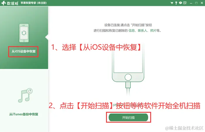步骤2:软件安装完成后,打开软件,用数据线将手机和电脑连接在一起。然后选择【从iOS设备中恢复】模式,该模式适合没有备份的用户使用,最后单击【开始扫描】。