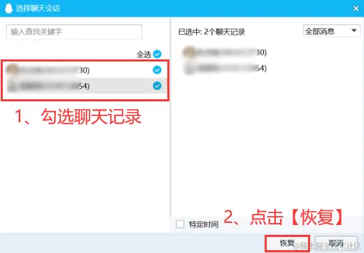 步骤3:然后勾选需要恢复的记录,最后点击【恢复】按钮即可,要注意的是,恢复聊天记录时请确保手机和电脑两台设备都处在同一网络下。