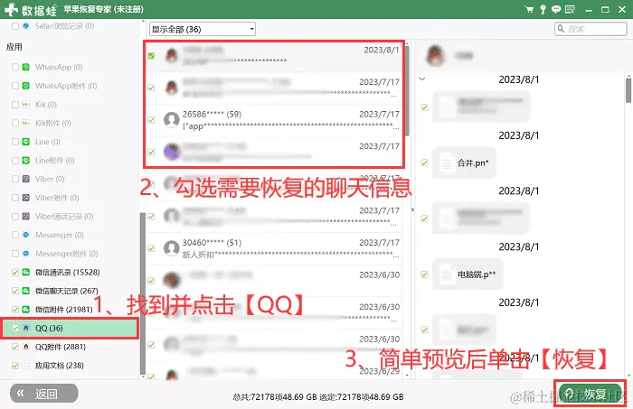步骤4:扫描完成后在左侧目录中下拉找到【QQ】,可以看到所有能扫描到的QQ聊天记录信息。找到想要恢复的聊天记录并将其勾选,然后单击【恢复】按钮即可保存在电脑上。
