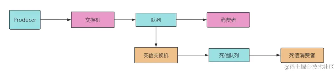 当死信产生时,如果我们定义了一个死信交换机(其实就是一个普通的交换机,只是用于处理死信,所以叫死信交换机),然后在死信交换机上绑定了一个队列(称作死信队列)。