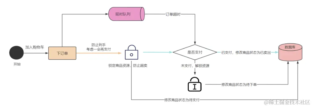如果没有支付,就取消订单,修改订单状态为待下单。如果已经支付,就将商品状态修改为已完成,并丢掉这条死信消息。