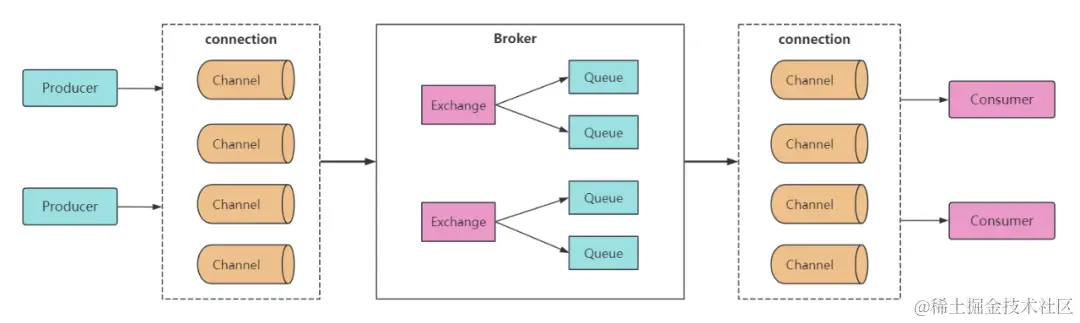 Binding)起来,定义了消息的路由规则; - 生产者将消息发布到交换机,交换机根据绑定规则将消息路由到一个或多个队列;
