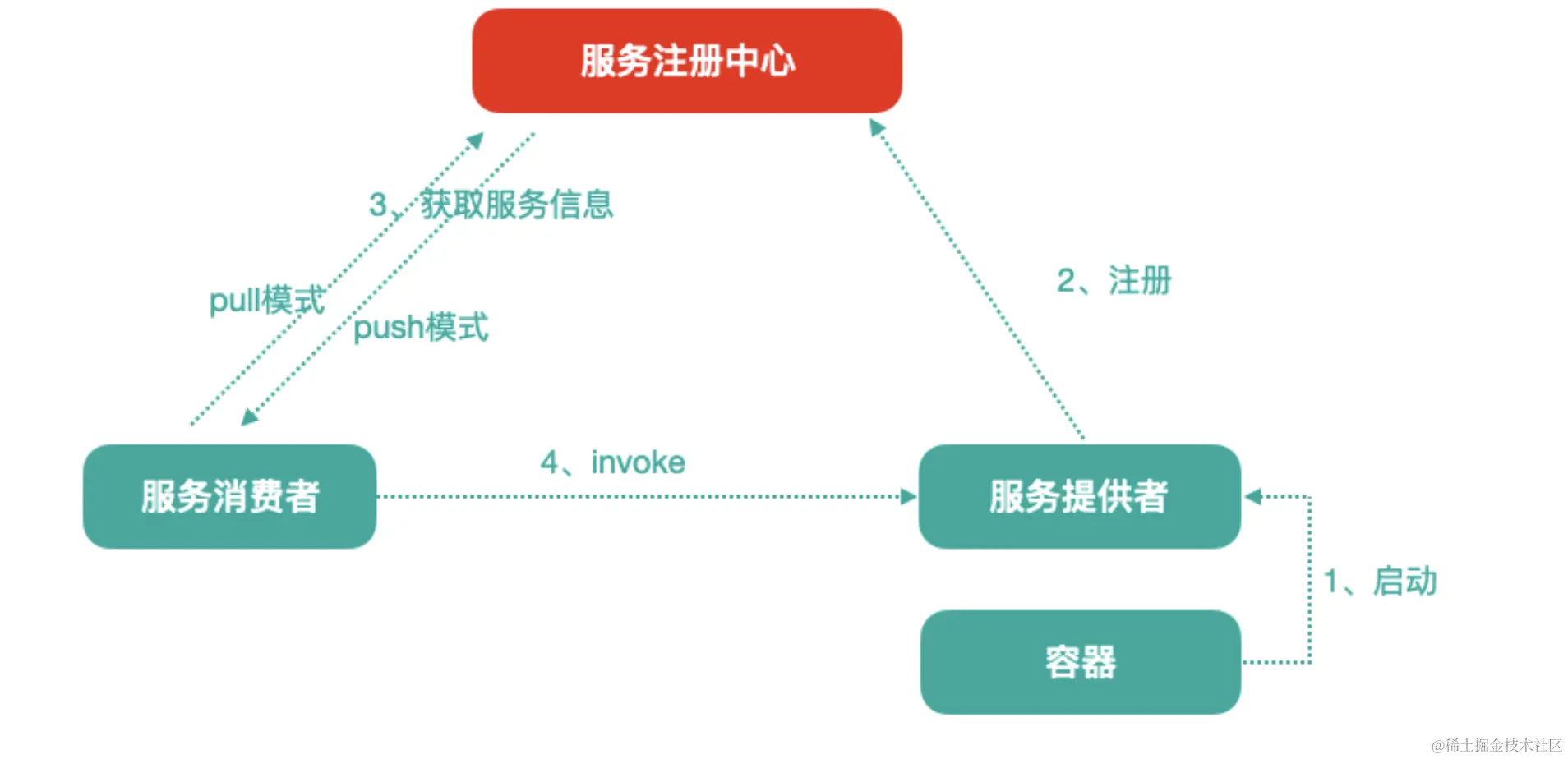 服务提供者将自己的服务地址登记到注册中心,服务消费者从注册中心查询所需要调用的服务地址,然后发起请求。