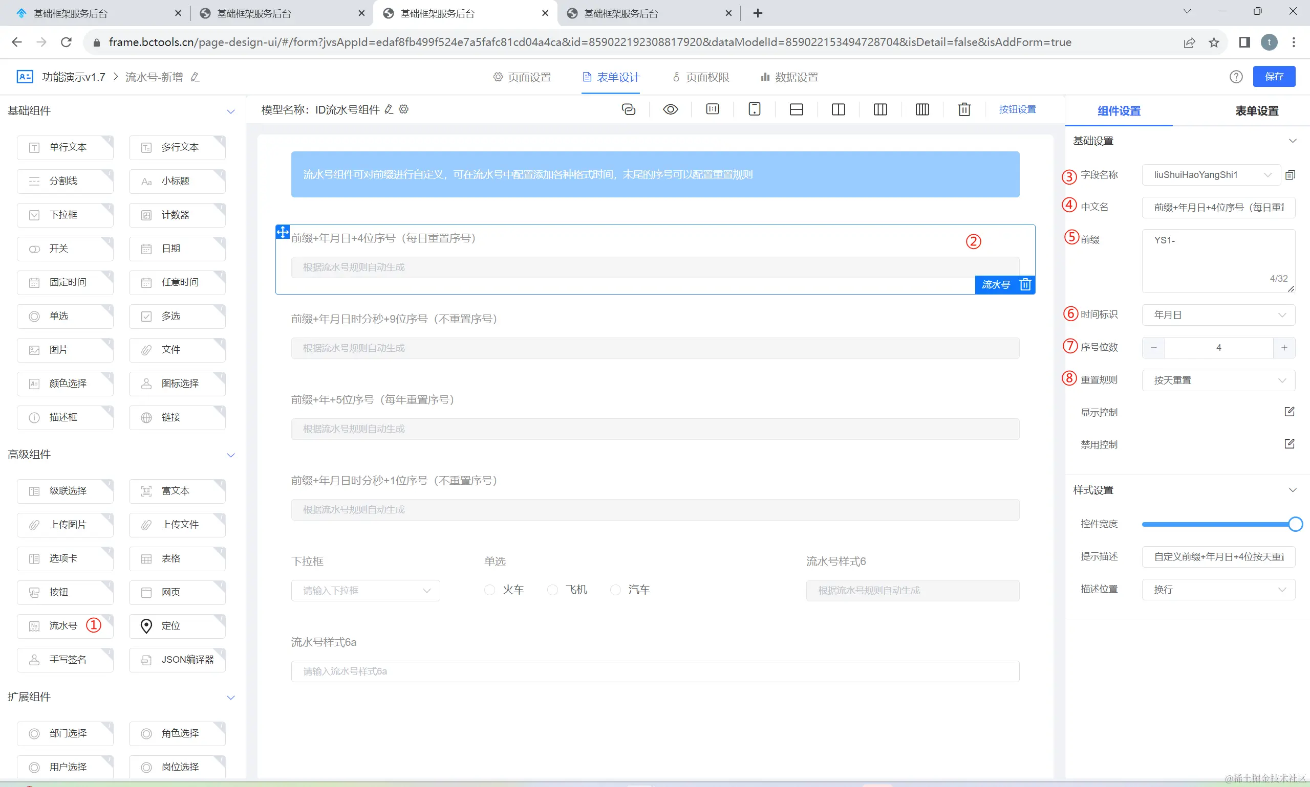 ⑧:设置流水号的重置规则,提供了“不设置”、“按年”、“按月”、“按日”、“按小时”多种方式对流水号进行重置