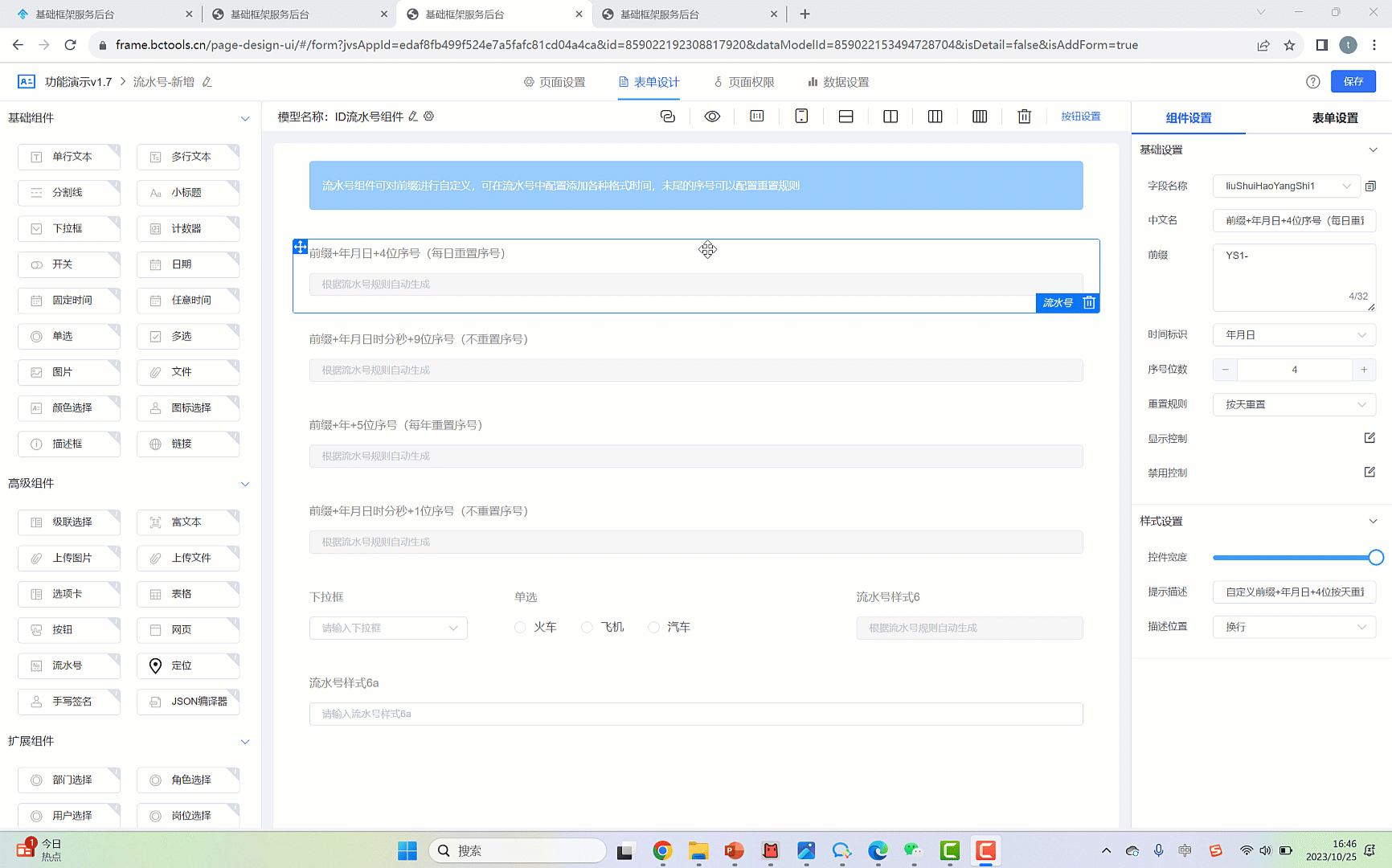 ②:将组件拖入表单画布中,点击流水号组件后,右侧将展示流水号的相应 配置项