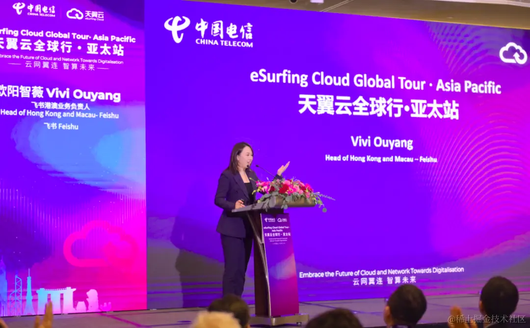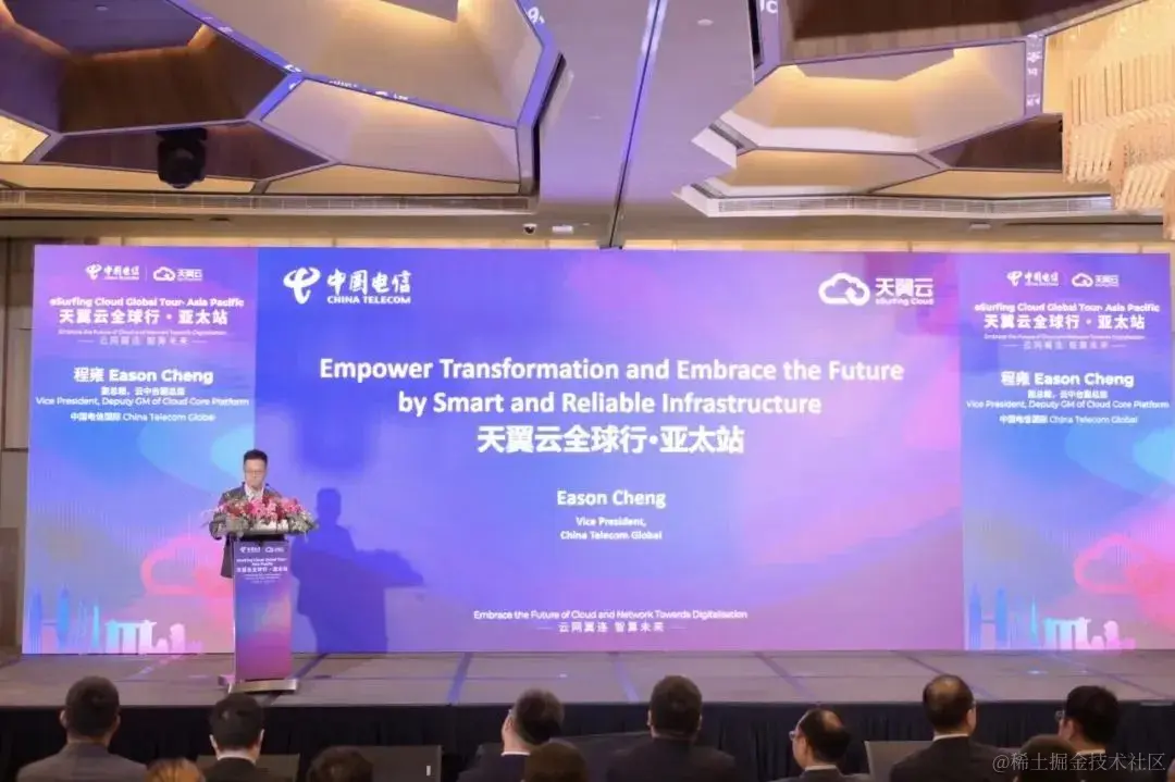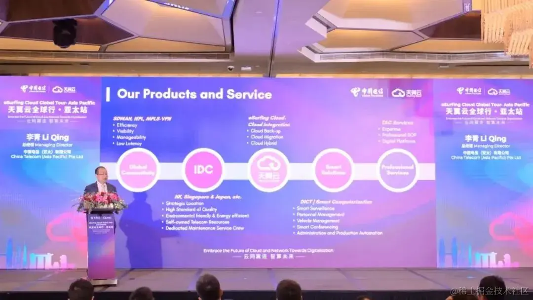 在分享会环节,中国电信国际公司副总裁&云中台副总监程雍分享了天翼云的发展历程及核心优势,细数其资源部署和产品体系。中国电信亚太公司总经理李青重点介绍了天翼云在亚太地区的战略布局,并针对不同行业客户上云场景和天翼云解决方案的优势展开分享。