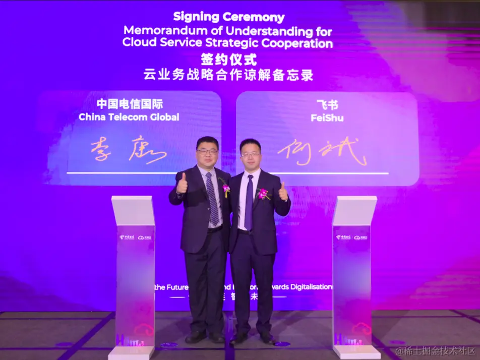 大会期间,中国电信国际公司与飞书签署合作谅解备忘录,中国电信国际公司副总经理李康与飞书副总裁何斌出席签约仪式,确立了双方长期合作伙伴关系。