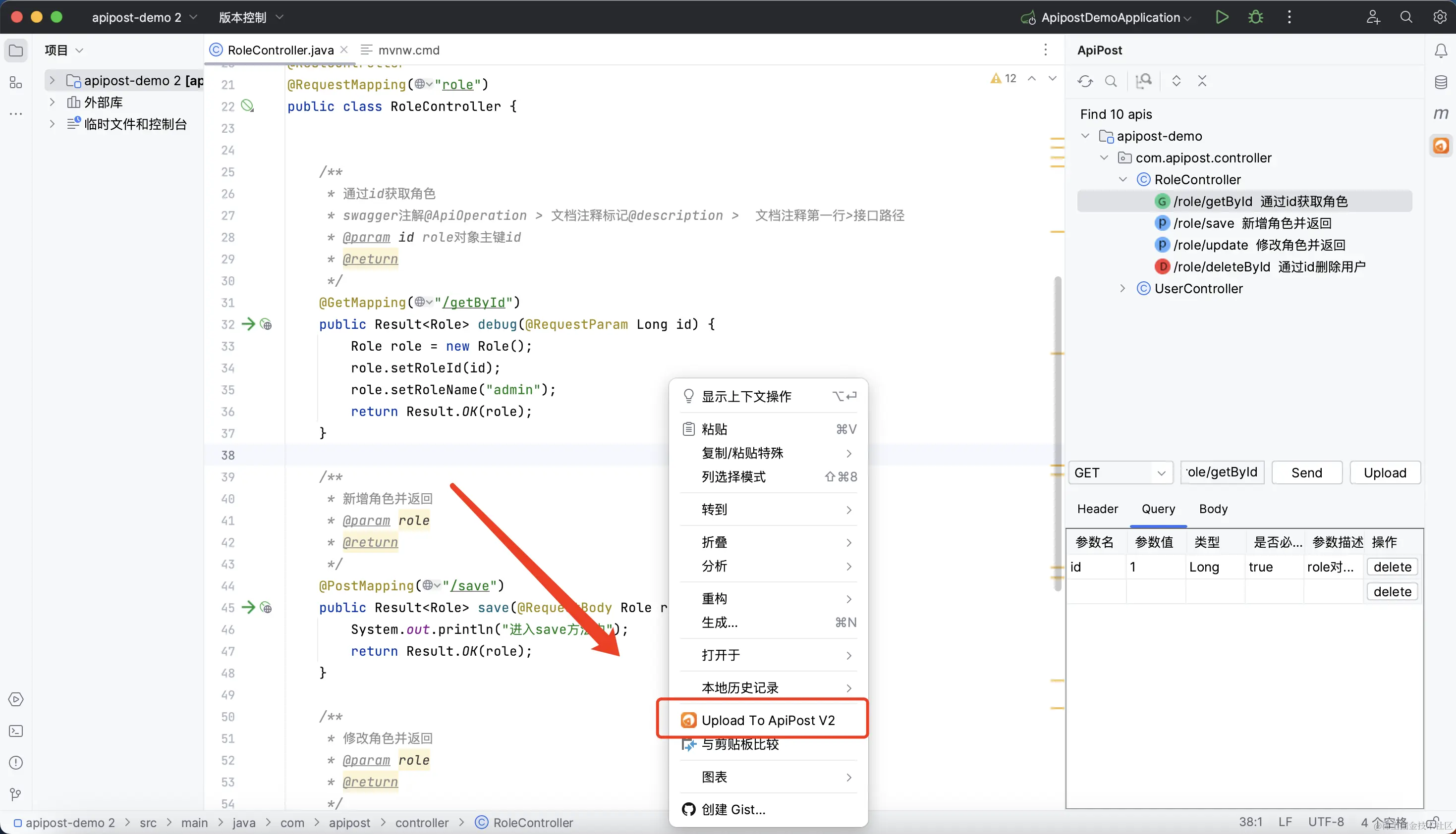 安装后右侧会有一个Apipost图标,可自动识别项目中的 controller选中接口即可发送请求: