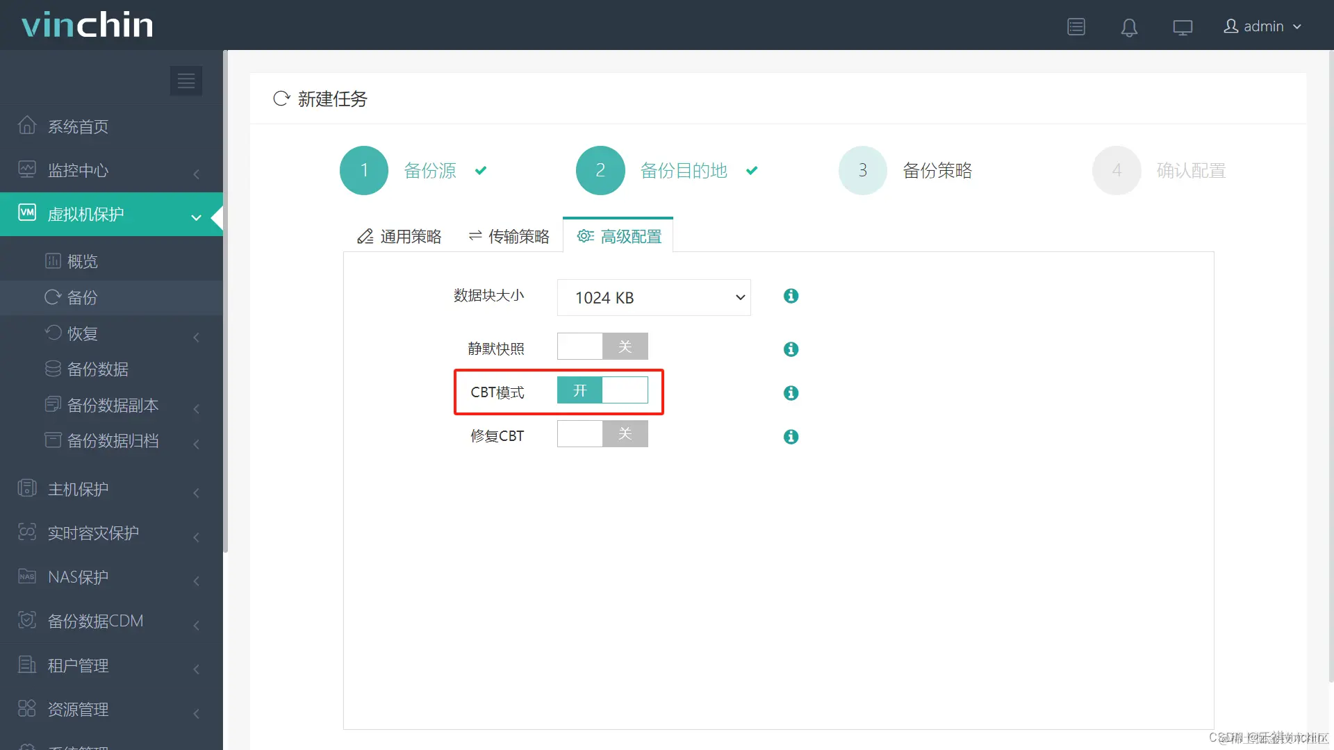 容灾备份系统中VMware CBT模式:开启后会在任务中自动启用虚拟机CBT,使用VMware平台提供的接口跟踪变化块数据,要求虚拟机硬件版本为7或更高版本。开启此功能后才能对虚拟机进行增量备份,否则只能对虚拟机进行完全备份。此功能开关默认开启。