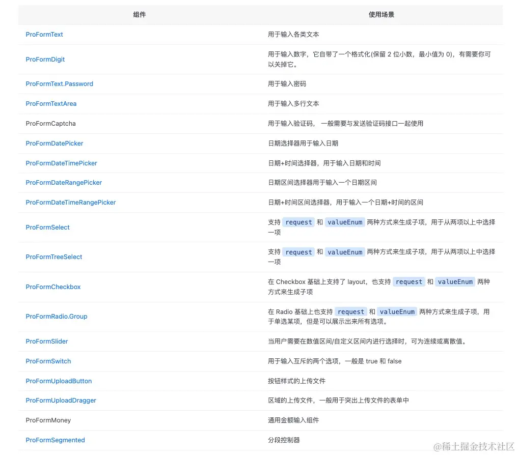 ProFormFields 表单项本质上是 Form.Item 和 组件的结合,每个表单项都支持 fieldProps