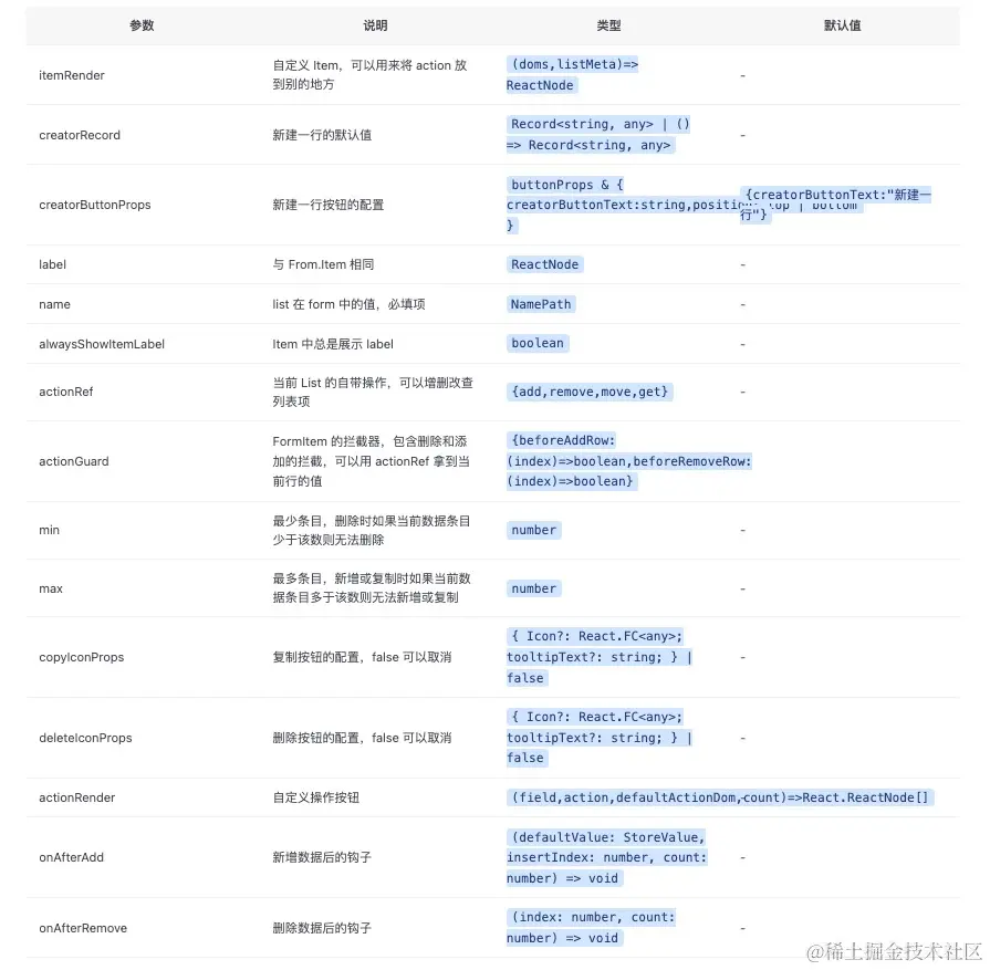 ProFormList 与 Form.List API 基本相同,自带操作按钮:删除和复制和新增按钮
