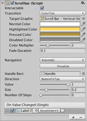 | On Value Changed | 滚动条的当前值发生变化时调用的 UnityEvent。该事件可将值作为 float 类型动态参数发送。 |