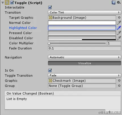 与其他 UI 元素不同,具有开关组 (Toggle Group) 组件的对象不必是画布对象的子项,但开关本身仍然是其子项。