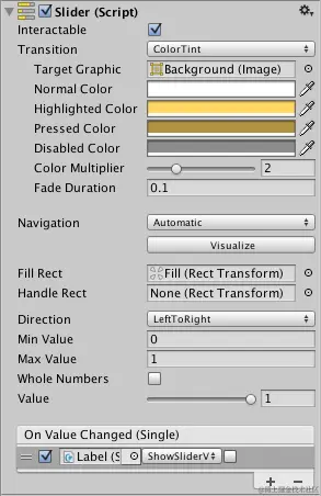 | On Value Changed | 滑动条的当前值已变化时调用的 UnityEvent。该事件可将当前值作为 float 类型动态参数发送。无论是否已启用 Whole Numbers 属性,该值都将作为 float 类型传递。 |