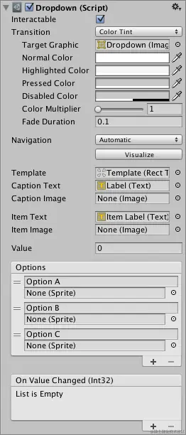 | On Value Changed | 用户单击了下拉列表中一个选项时调用的 UnityEvent。 |