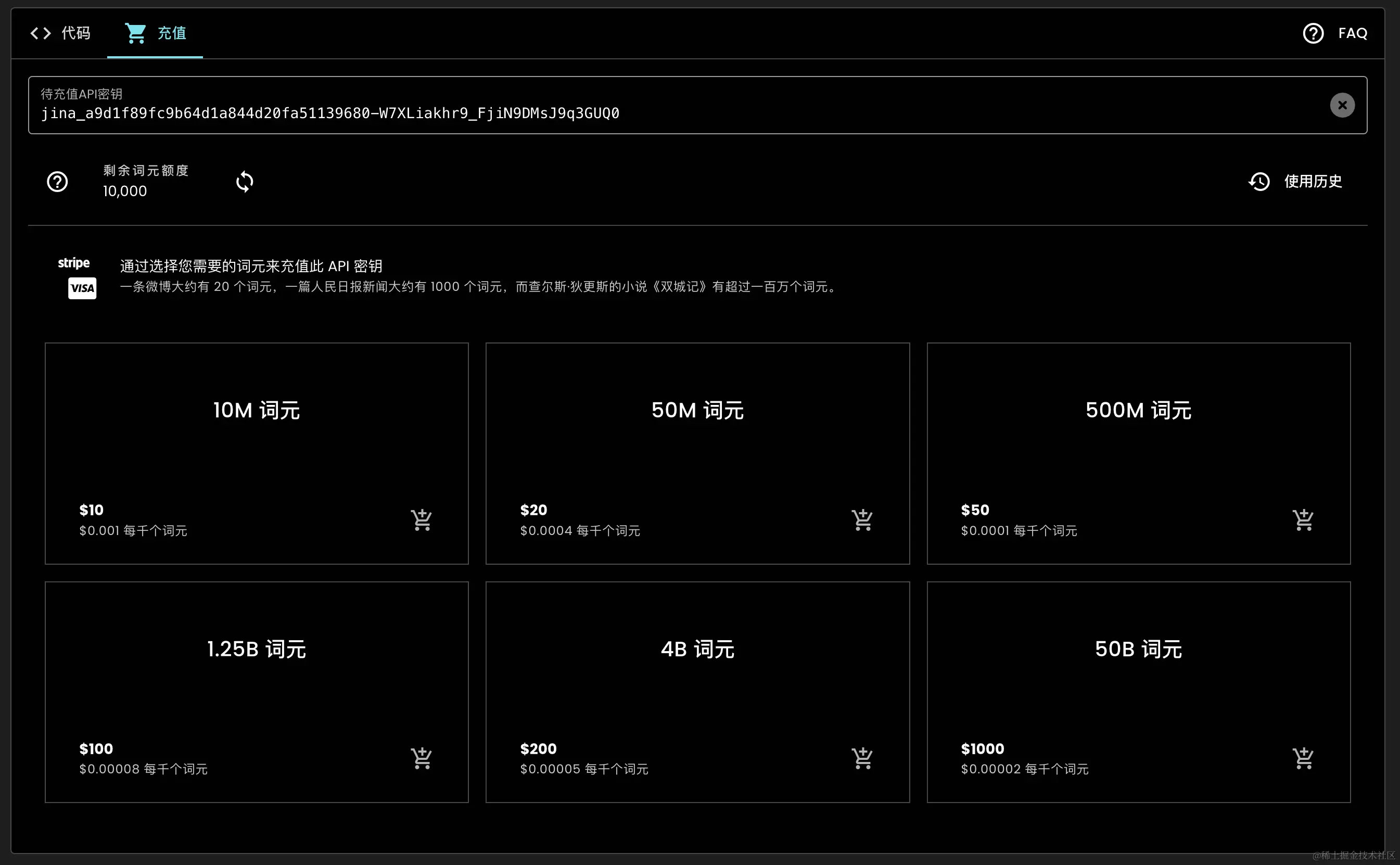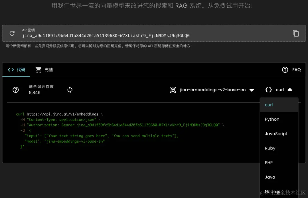新用户无需注册,打开网页 jina.ai/embeddings/… API 密钥,该密钥包含 10,000 tokens 的使用额度。