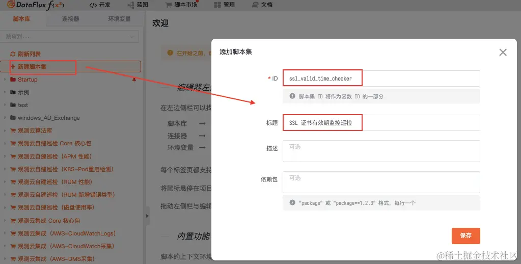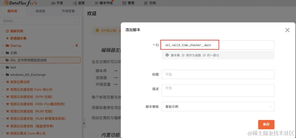5.进入「开发」-「SSL证书有效期监控巡检」-「新建脚本」,填写脚本 ID。