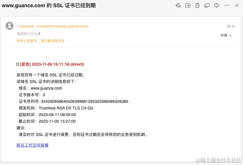 证书有效期的缩短,增加了证书更新的频率,导致使用加密证书的网站所有者和企业的管理周期变得更加复杂,对许多依赖数字证书保护系统的公司来说,带来很大的证书管理成本,对于 SSL 证书的管理者来说,建设一套 SSL 证书有效期的监控巡检系统非常有必要。