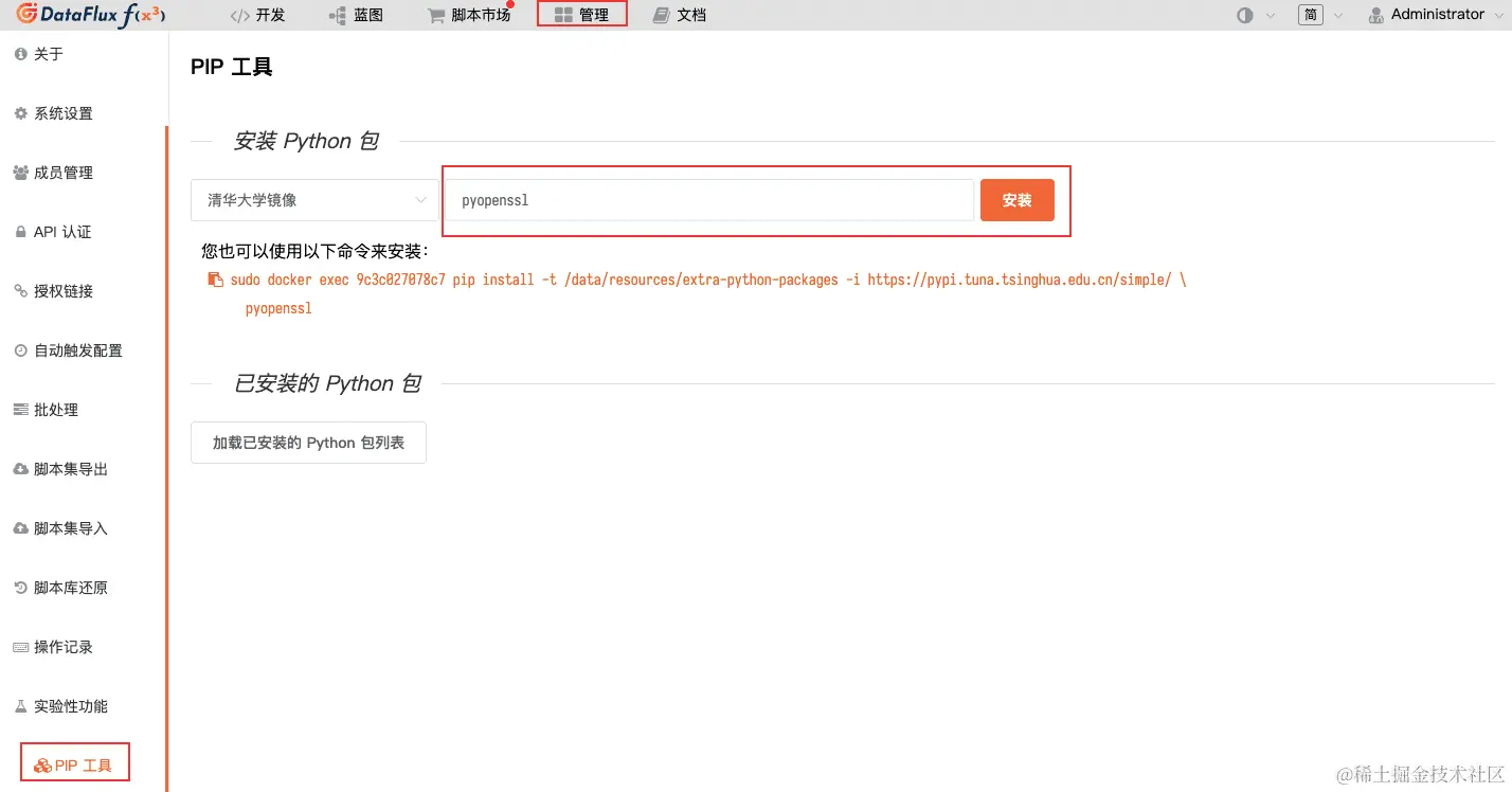 2.进入「管理」-「PIP 工具」,输入 pyopenssl,点击「安装」。