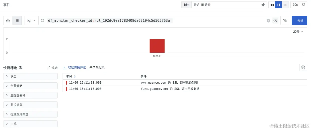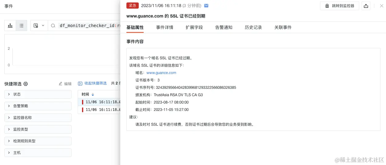 - 通过观测云「事件」,可以对 SSL 证书过期事件进行管理