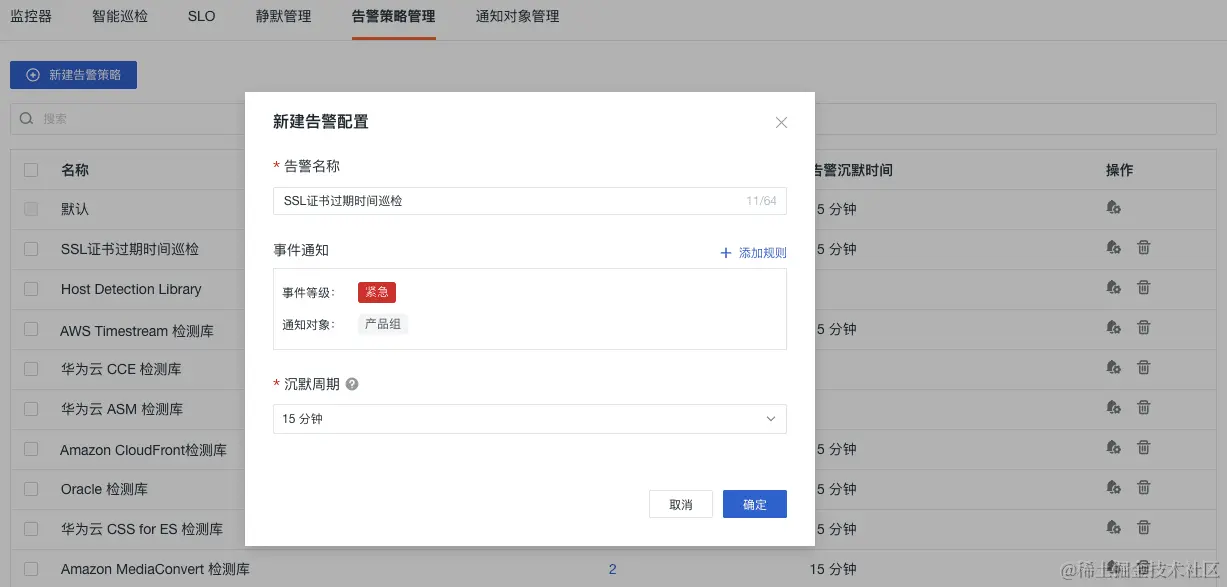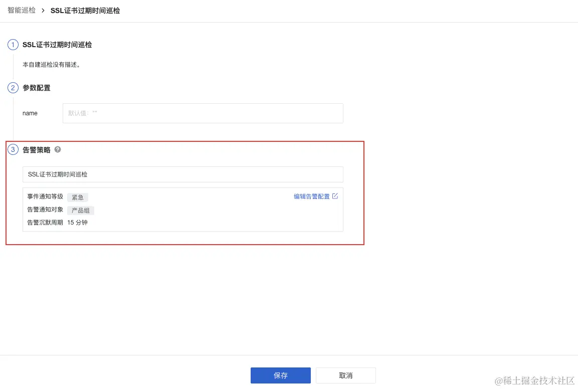 3.进入「监控」-「智能巡检」,点击修改「SSL 证书过期时间巡检」,「告警策略」选择第二步创建的告警策略。