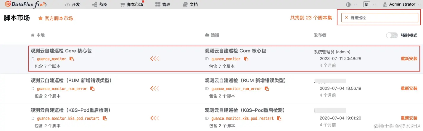 3.进入「脚本市场」-「官方脚本市场」,搜索并安装「观测云自建巡检 Core 核心包」。
