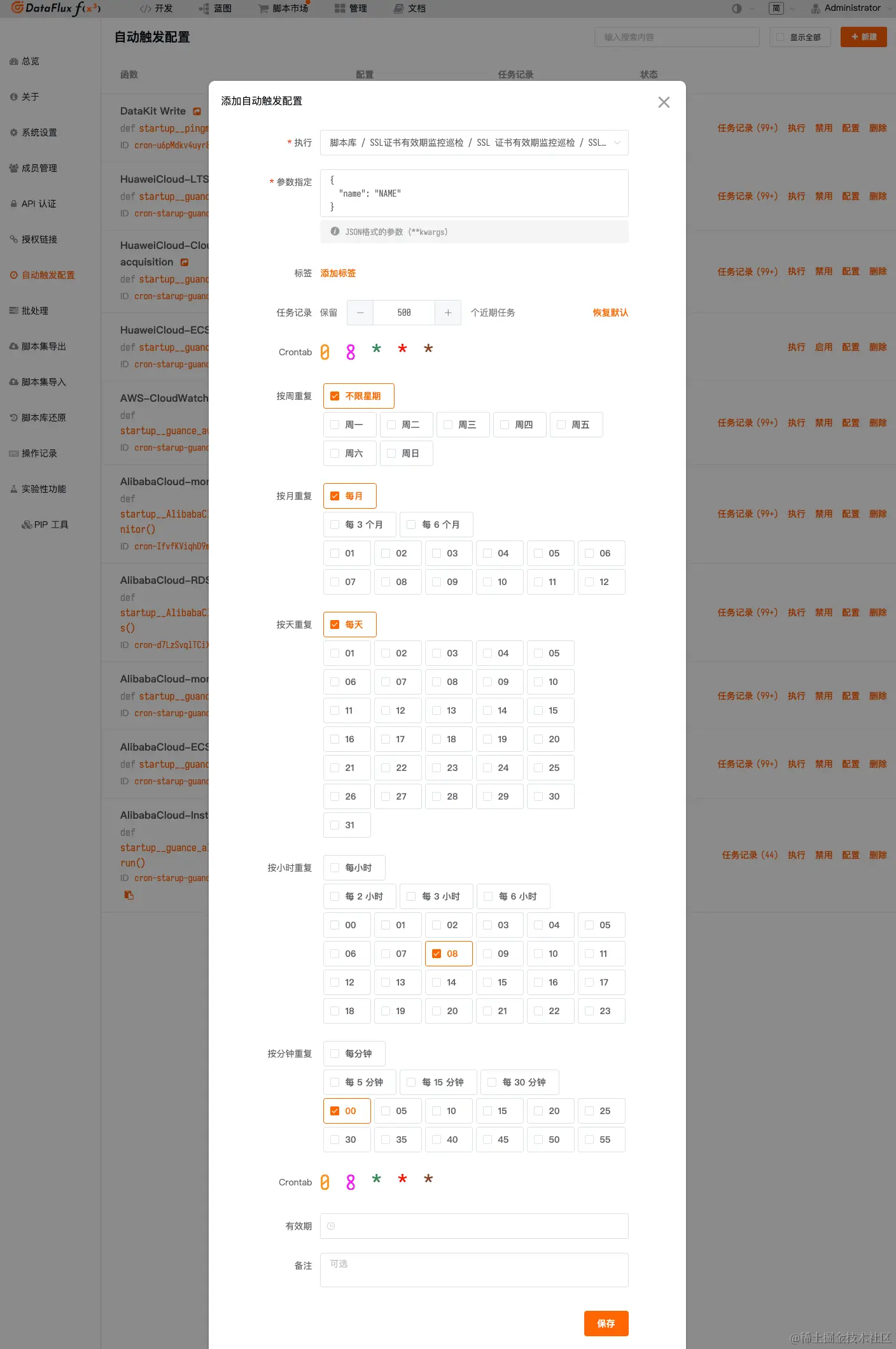 7.进入「管理」-「自动触发配置」-「新建」,选择「执行函数」,按照实际要求来设置脚本执行频率,以下设置为每天 08:00 定时触发脚本