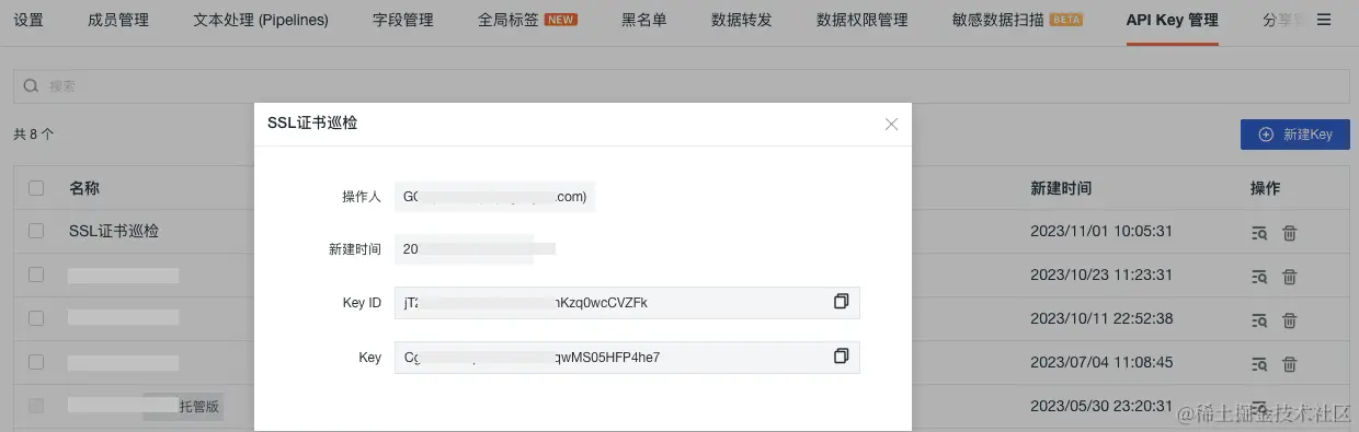 在观测云控制台「管理」 -「API Key 管理」-「新建 Key」,保留生成的 Key ID 和 Key 。