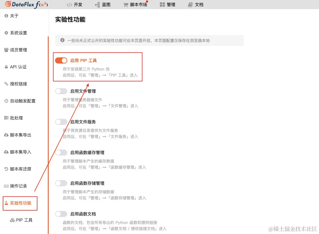 1.进入步骤一搭建的 Func 平台,进入「管理」-「实验室」功能,「开启 PIP 工具模块」。