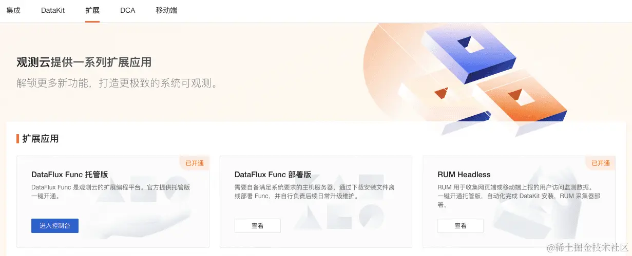 或者登录到在观测云控制台「集成」-「扩展」,开通「DataFlux Func 托管版」。