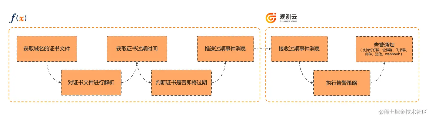 本文实现的 SSL 证书有效期监控巡检系统原理比较简单,大致流程如下图所示。本质上就是通过 Python 脚本获取域名的 SSL 证书文件,一般来说证书文件内容会包括颁发机构、证书序列号、有效期起始时间、有效期结束时间等信息,获取证书的有效期结束时间后,判断证书是否即将过期,将过期事件推送至观测云(www.guance.com),巡检系统配置对应的告警策略,发生事件告警后推送至钉钉群或企微群。