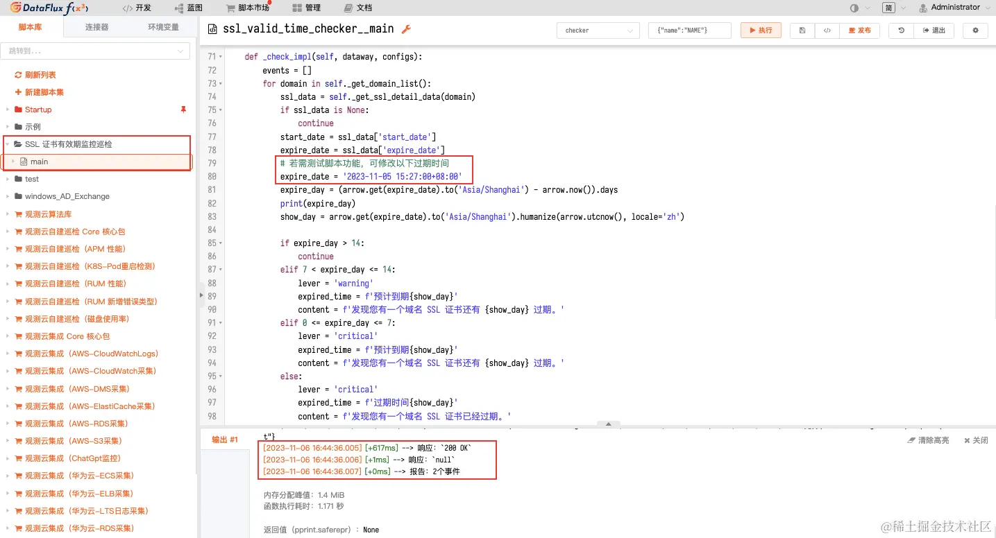 - 若需测试脚本过期时间提示功能,可打开 80 行注释,可自定义证书过期时间,点击「执行」可测试脚本查看结果