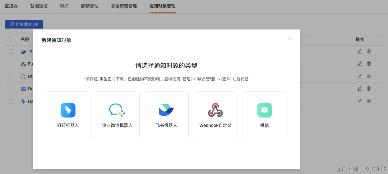 1.进入观测云控制台(console.guance.com),选择「监控」-「通知对象管理」-「新建通知对象」,按照实际要求添加通知对象,具体步骤可参考添加页面「更多帮助」。