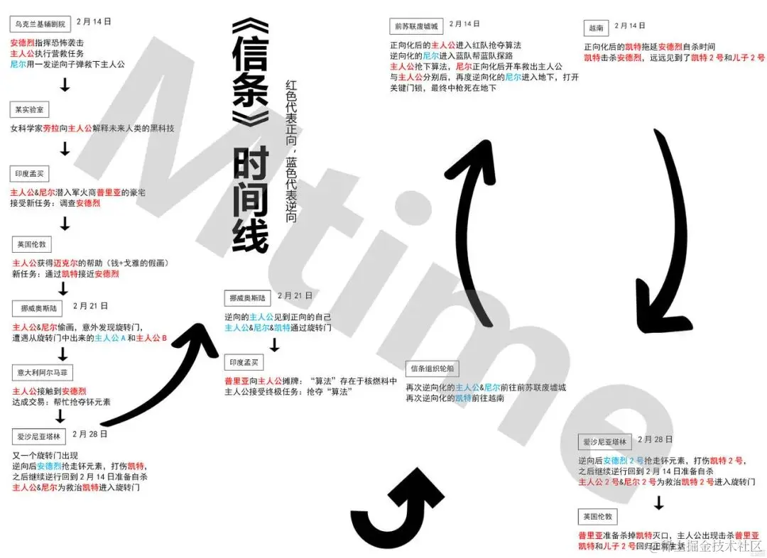 类比来说,当我们看一篇长篇小说时,当我们想搞清楚核心情节的发生顺序时,我们往往不是翻看原文,而是在阅读中就记录下一条时间线,当发生关键剧情时,将其记录在整个时间线的节点之上。之前大火的电影《信条》,相信很多小伙伴也都是通过时间线的方式才真正搞清楚剧情是如何发展的。