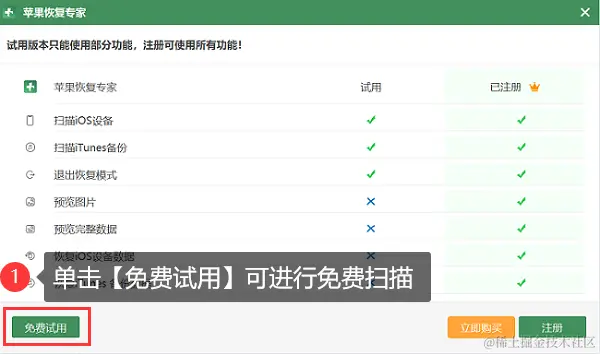 步骤2:安装成功后打开软件,然后用数据线连接好您的iPhone和电脑。这时,软件会弹出一个注册提示框,请单击【免费试用】获取免费扫描资格。