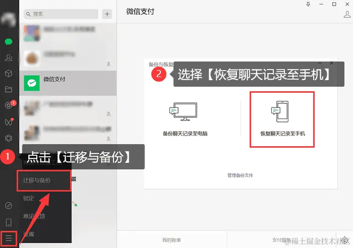 步骤1:在电脑微信左下角的【更多】目录中找到【迁移与备份】。