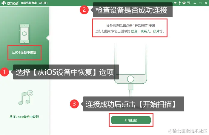 步骤 3:软件默认选中【从iOS设备中恢复】模式,只需要单击【开始扫描】,软件便会对您的设备进行深度扫描。